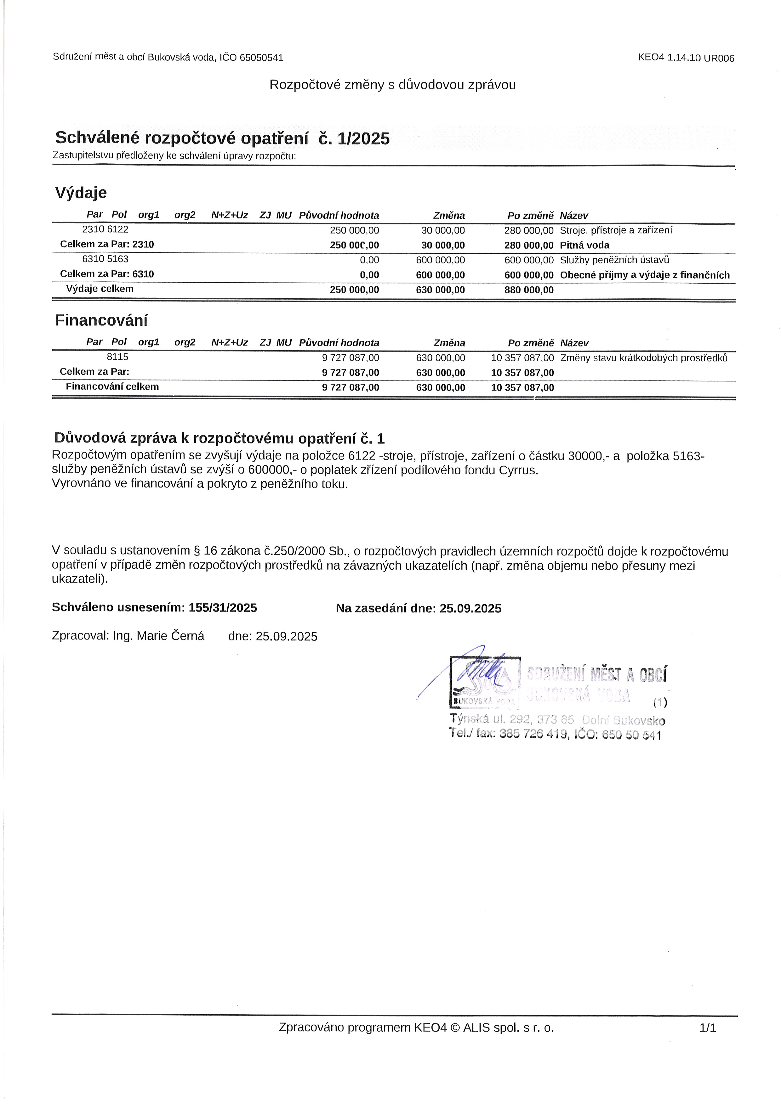 Rozpočtové opatření č. 1/2025